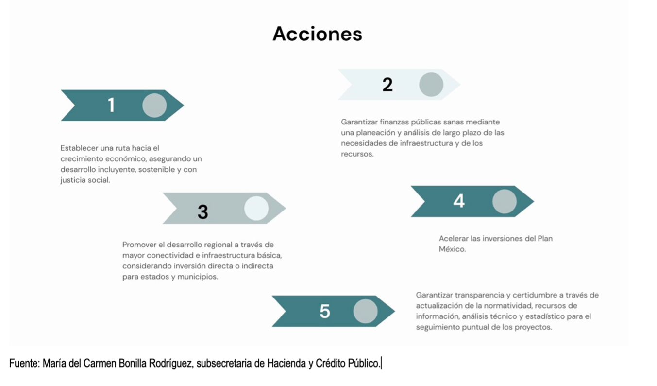 impulsar la economía con miras a posicionar a México entre las 10 economías más grandes; superar el 25% de inversión respecto al PIB en 2026 y más del 28% para 2030.
