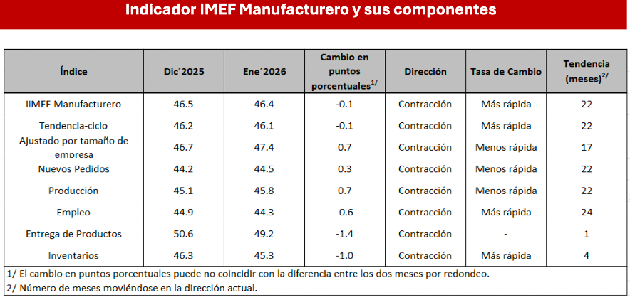 El sector manufacturero prolongó su ciclo contractivo por vigésimo segundo mes consecutivo, mientras que el sector servicios mostró una pérdida de tracción más marcada, revirtiendo avances previos. Estos resultados contrastan con la expansión del PIB de 0.8% trimestral observada en el cuarto trimestre de 2025, impulsada principalmente por servicios e industria, pero sugieren que
