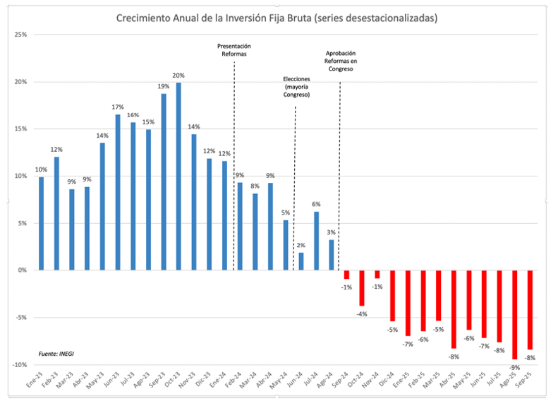 La gráfica siguiente muestra la dinámica en la inversión fija. Indica 13 meses de bajas continuas con contracciones de entre 8 y 9% anual.