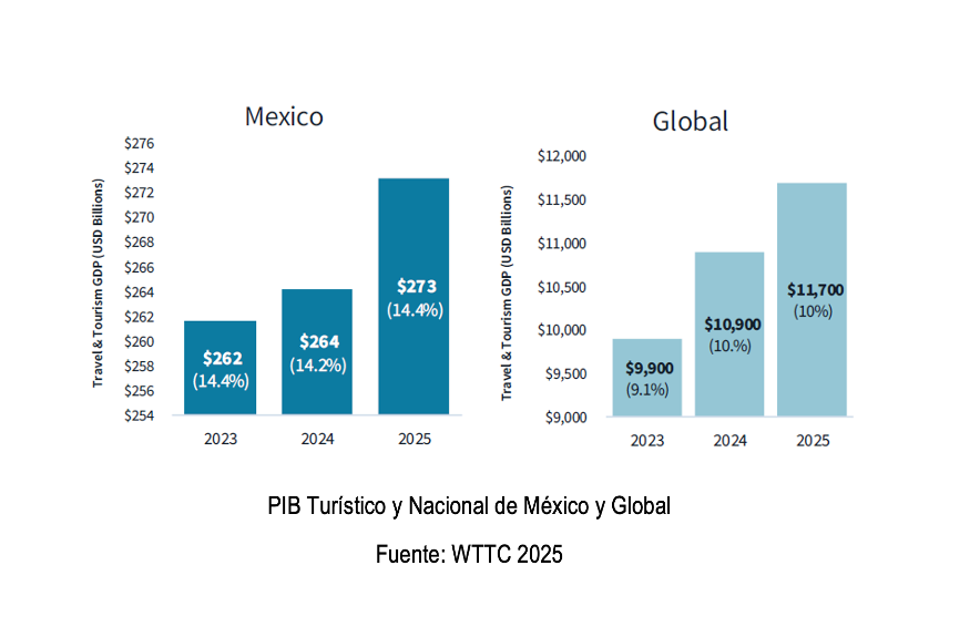 el PIB turístico de México crecerá alrededor de 3.4%, alcanzando 273 billones de dólares, lo que representa una mejora respecto al 1% registrado en 2024; sin embargo, el porcentaje anterior