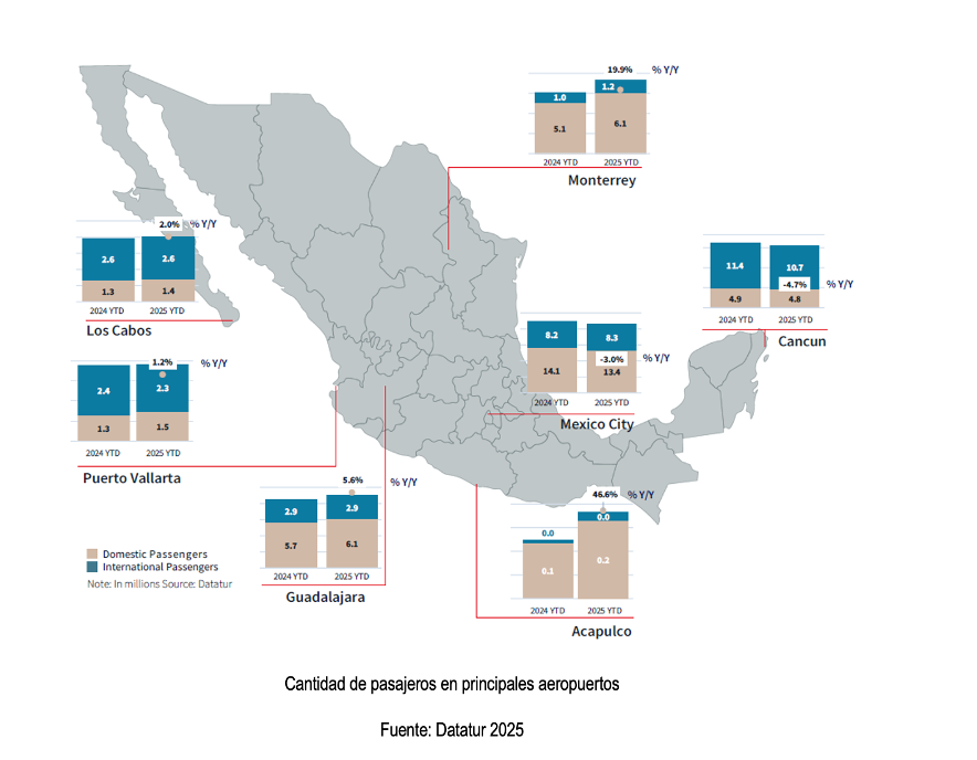 hub regional con un sólido 5.6% de crecimiento, alcanzando más de 9 millones de pasajeros. Los destinos de playa del noroeste mantienen un crecimiento moderado, pero sostenido: Los Cabos, +2% subiendo a 4 millones y Puerto Vallarta, +1.2% para pasar a 3.8 millones, lo que pone en evidencia la madurez y estabilidad de estos mercados.