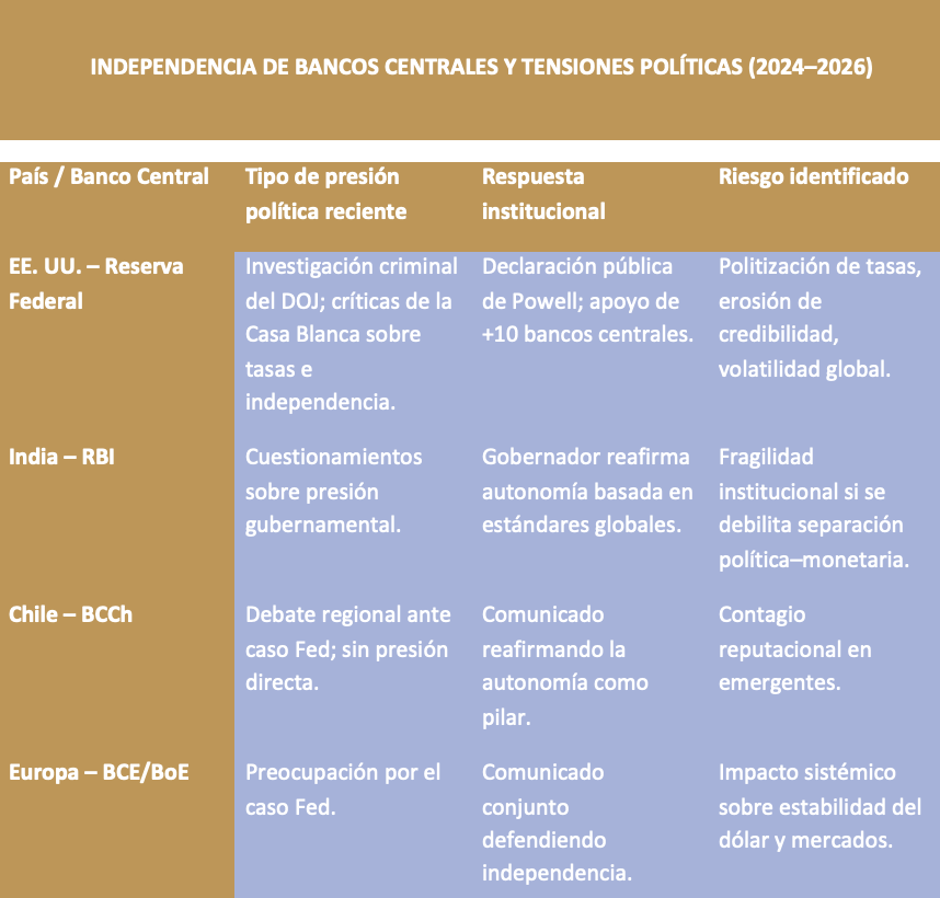 Powell no está solo, la independencia que él ejerce en la Fed y la autonomía que reclama está respaldada. Más de diez bancos centrales —incluyendo el BCE, BoE, Canadá, Australia, Corea y Brasil— firmaron un comunicado conjunto en apoyo a su autonomía. Incluso autoridades de economías emergentes, como el RBI de India, subrayaron la importancia de preservar la autonomía monetaria. En América Latina, el Banco Central de Chile reiteró que la autonomía es un pilar que debe mantenerse como principio rector.