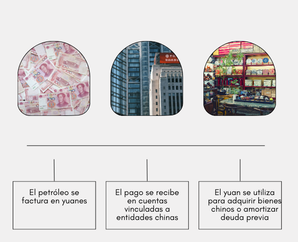 relación energética entre China y Venezuela, donde parte del petróleo se ha comercializado fuera del dólar, utilizando el.